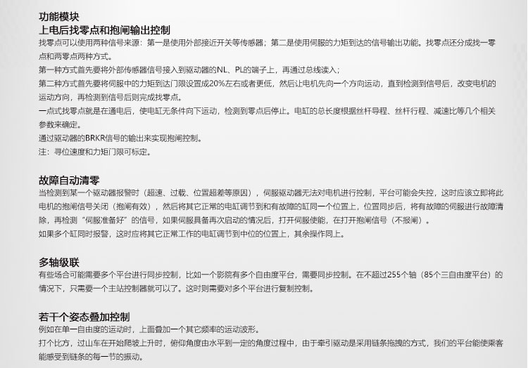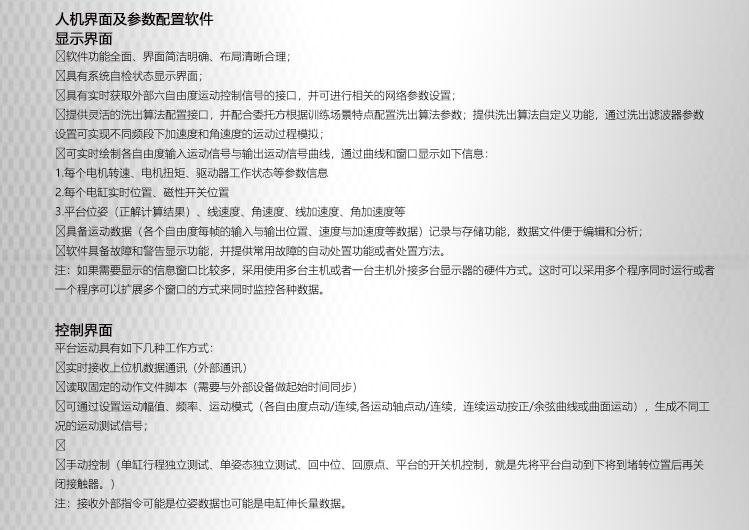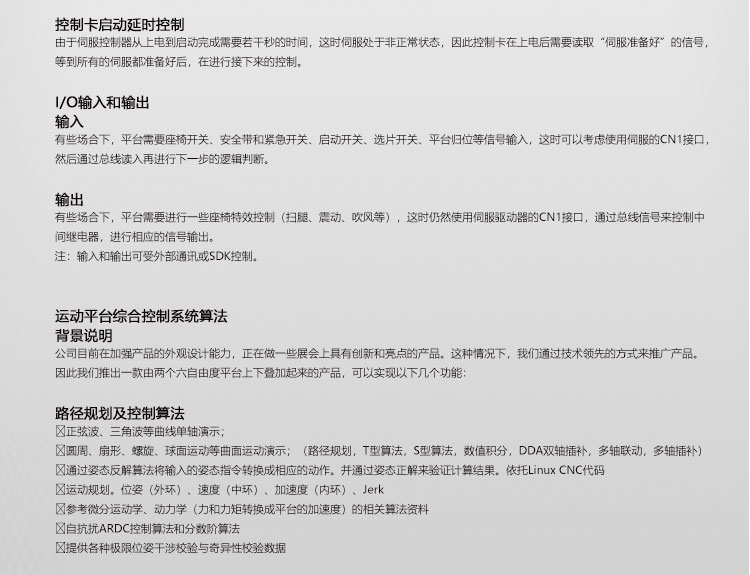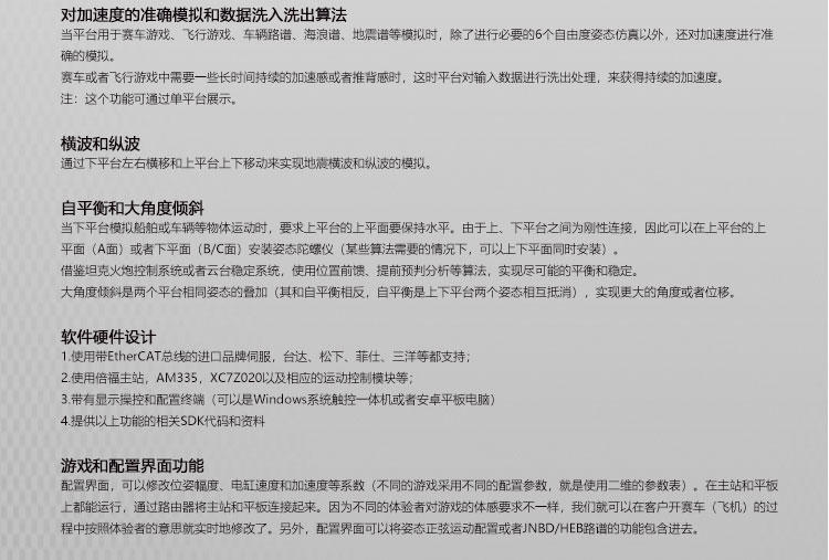 答: 我公司主要從事仿真平臺、六自由度平臺和運(yùn)動平臺控制卡的研發(fā)、生產(chǎn)與銷售,同時承接大型4D/5D/7D影院等工程。專注技術(shù)領(lǐng)先,提升用戶體驗(yàn)是我們的追求!