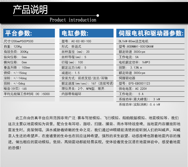 關(guān)鍵詞: 三自由度平臺,電動仿真平臺,地震模擬體驗平臺