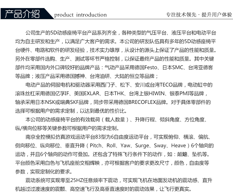 答: 我公司主要從事仿真平臺(tái)、六自由度平臺(tái)和運(yùn)動(dòng)平臺(tái)控制卡的研發(fā)、生產(chǎn)與銷售,同時(shí)承接大型4D/5D/7D影院等工程。專注技術(shù)領(lǐng)先,提升用戶體驗(yàn)是我們的追求!