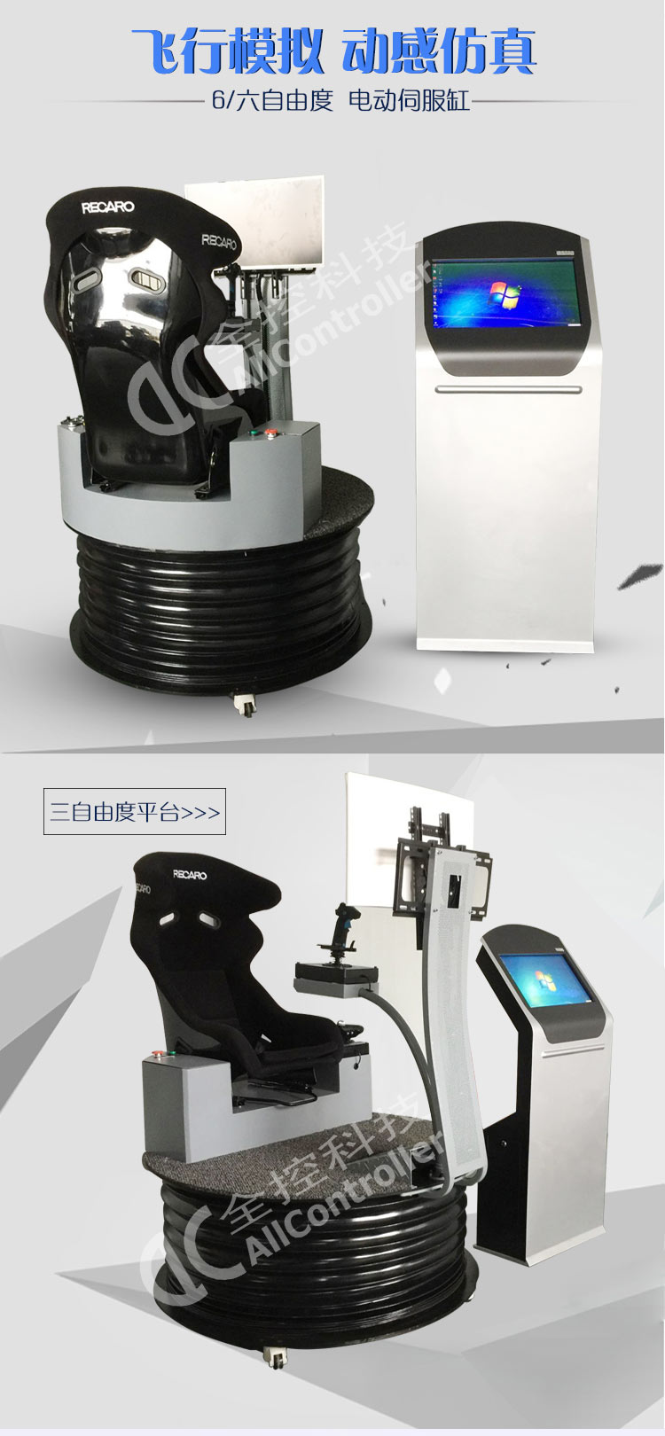 3.平臺是屬于三自由度電動平臺,它可以實現空間的三個運動姿態,即前后俯仰,左右滾轉,上下升降。駕駛一次我們這種平臺模擬機不亞于進行了一次真實的空戰。