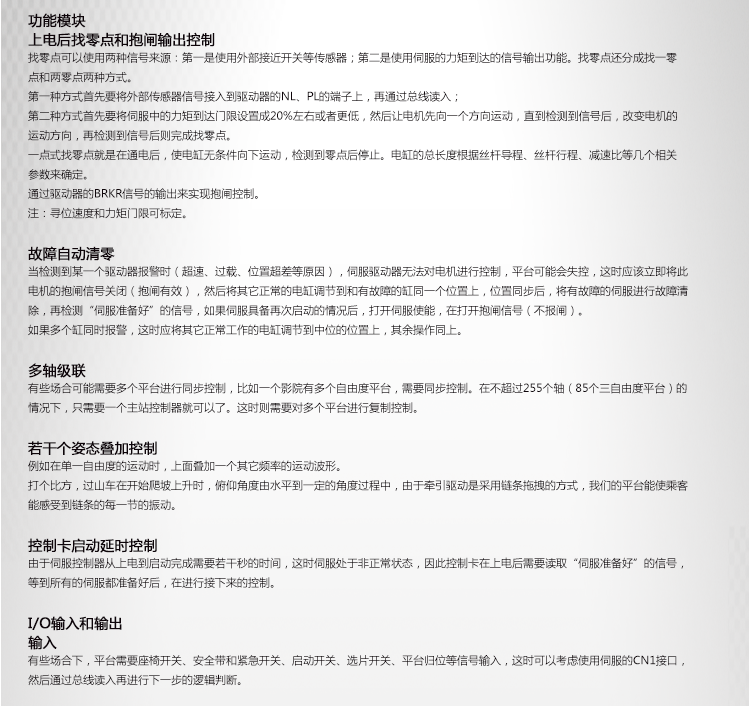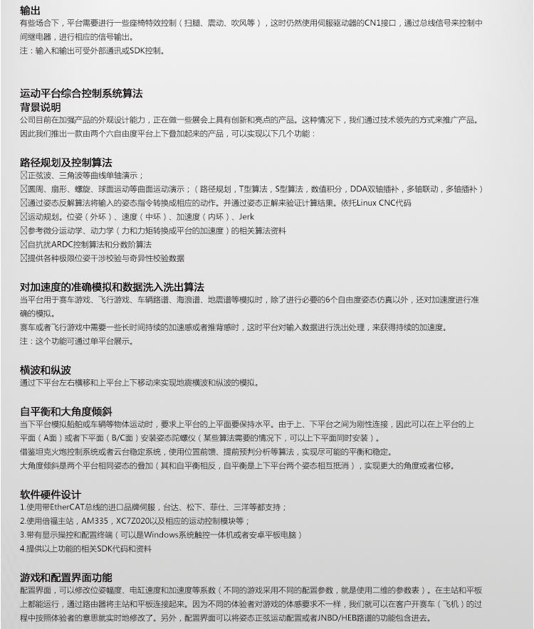 答: 我公司主要從事仿真平臺、六自由度平臺和運(yùn)動平臺控制卡的研發(fā)、生產(chǎn)與銷售,同時承接大型4D/5D/7D影院等工程。專注技術(shù)領(lǐng)先,提升用戶體驗(yàn)是我們的追求!
