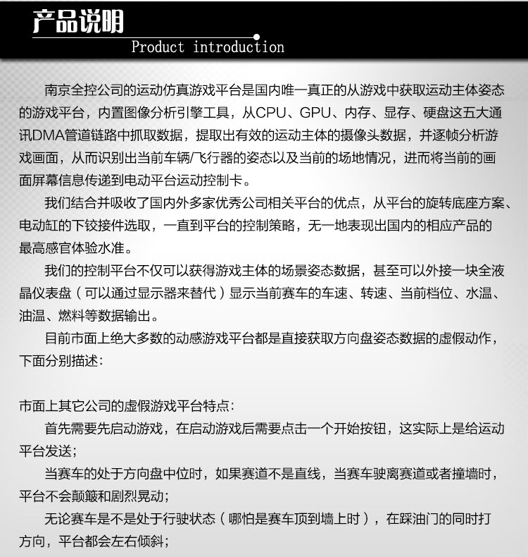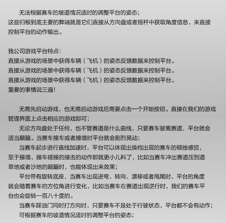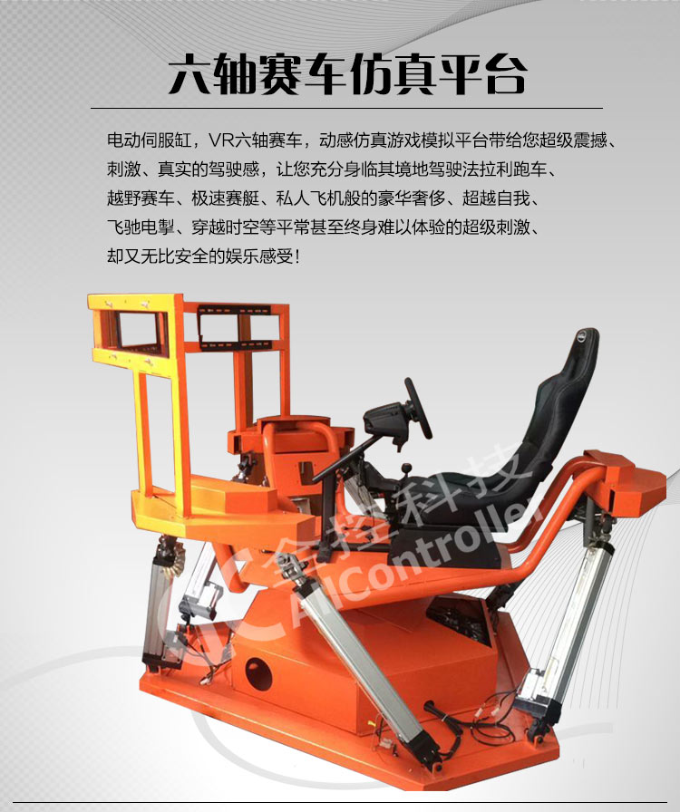 采用國際領先動感控制技術,使用電動缸六自由度動感平臺,真正做到與游戲緊密結合,可以完成俯沖、爬升、傾斜、拐彎、旋轉、下墜、顛簸等高難度的驚險刺激動作,從動感、駕駛操控、影音、仿真方面給予用戶超真實的體驗。具有極高趣味性,新穎性,刺激性,震撼性,娛樂性,科普性, 可達到大量、快速吸引客戶眼球和超高級娛樂體驗的效果。