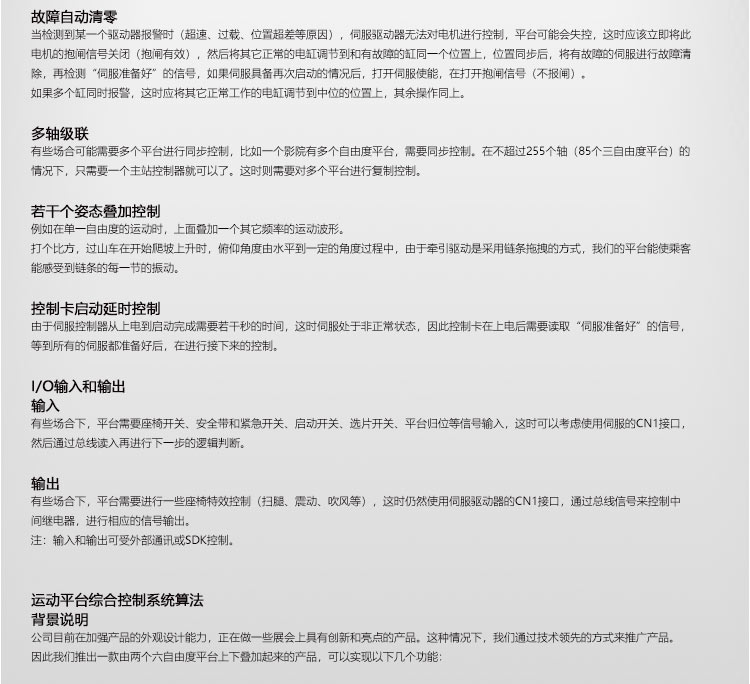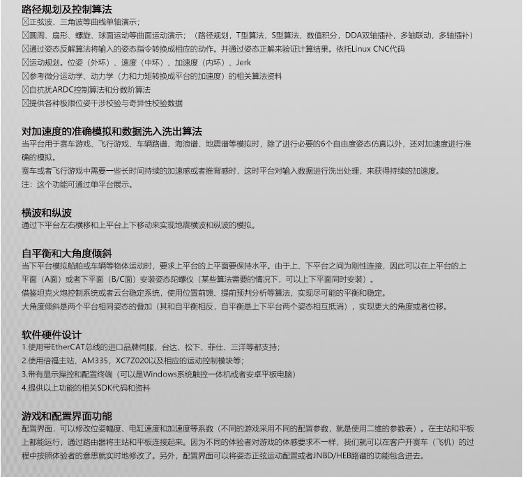 答: 我公司主要從事仿真平臺、六自由度平臺和運動平臺控制卡的研發、生產與銷售,同時承接大型4D/5D/7D影院等工程。專注技術領先,提升用戶體驗是我們的追求!
