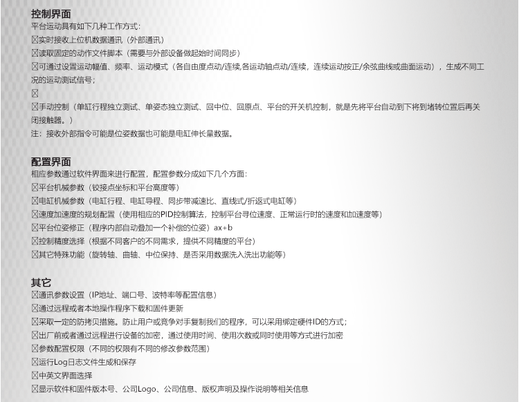 駕駛模擬器原理:駕駛?cè)藛T在駕駛艙內(nèi)感受視景和聲音上的仿真,通過手柄(方向盤)操縱視景內(nèi)的汽車行使在虛擬的場(chǎng)景中,在此同時(shí)汽車會(huì)產(chǎn)生一系列的數(shù)據(jù),如車身姿態(tài)、加速度、角加速度等,我們通過計(jì)算機(jī)將這些數(shù)據(jù)處理成六自由度平臺(tái)接受的指令姿態(tài)數(shù)據(jù),再通過網(wǎng)絡(luò)協(xié)議,實(shí)時(shí)發(fā)送至六自由度平臺(tái)運(yùn)動(dòng)控制卡,控制卡內(nèi)置六自由度平臺(tái)算法,將指令姿態(tài)解算成電動(dòng)缸缸長(zhǎng),速度等,驅(qū)使運(yùn)動(dòng)平臺(tái)做出與視景內(nèi)容里相同的姿態(tài),進(jìn)而達(dá)到仿真駕駛的效果。