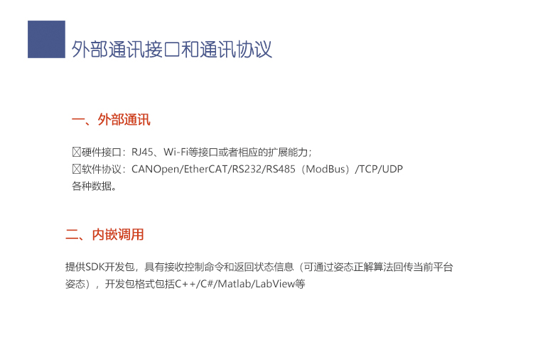 l 提供SDK開發包,具有接收控制命令和返回狀態信息(可通過姿態正解算法回傳當前平臺姿態),開發包格式包括C++/C#/Matlab/LabView等