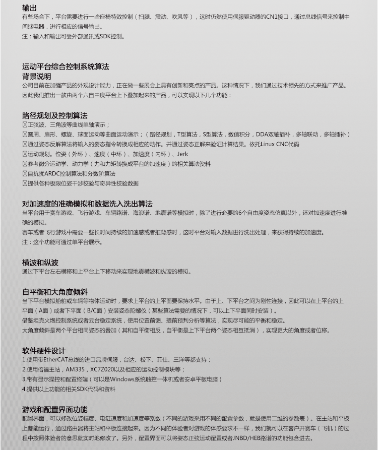 公司生產的 5D 動感座椅平臺產品系列齊全,各種類型的氣壓平臺、液壓平臺和電動平臺均為自主研發和生產,以滿足廣大客戶的需求。本公司的研發隊伍具有多年的5D 動感座椅平臺硬件、電路和軟件的研發經驗,技術實力雄厚,從設計的源頭上保證了產品的性能和質量。另外在零部件選購、生產、測試等環節嚴格控制,以保證最終產品的性能和質量。