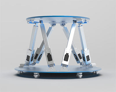 該機器人為六自由度,有六條支鏈,每條支鏈的兩端為球副,中間由一移動副聯接兩桿。由于其剛度高和重負載的優點,Stewart機器人常被用于各種重載的模擬臺,例如飛行模擬器、地震模擬臺、航天對接裝置,以及用于確定組合載荷下輪胎的性能等;在民用方面的應用包括電影座椅等。